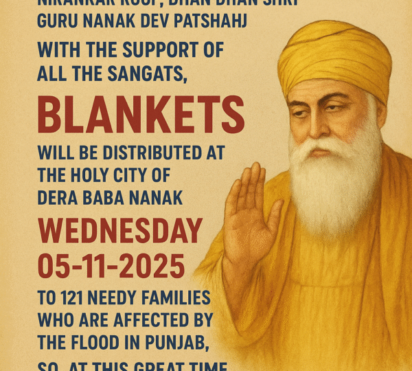 It is a humble request to all the Sangats that on the occasion of the Holy Birth of Nirankar Roop, Dhan Dhan Shri Guru Nanak Dev Patshah Ji, with the support of all the Sangats, Blankets will be distributed at the Holy City of Dera Baba Nanak on Monday, 05-11-2025, to 121 needy families who are affected by the flood in Punjab. so, at this great time, get the blessings of Satguru Nanak Patshah Ji’s by contributing your valuable contribution to this event